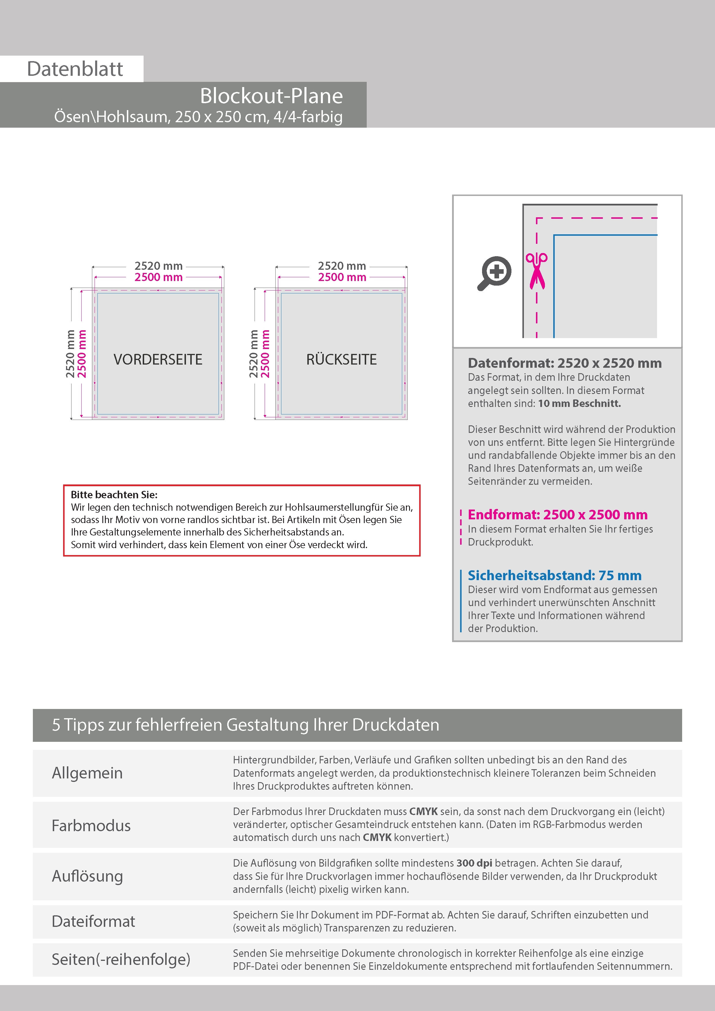 Hochwertige Blockout-Plane 250 x 250 cm, 4/4-farbig bedruckt, Hohlsaum oben und unten (Durchmesser Hohlsaum 6,0 cm)